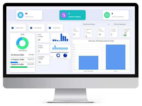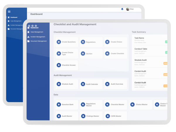 A system that allows creating question banks, choices & choice types with regulations attached. Making it easy to build checklists for audits and also schedule audits seamlessly. You can also get all audit reports and always be on track.