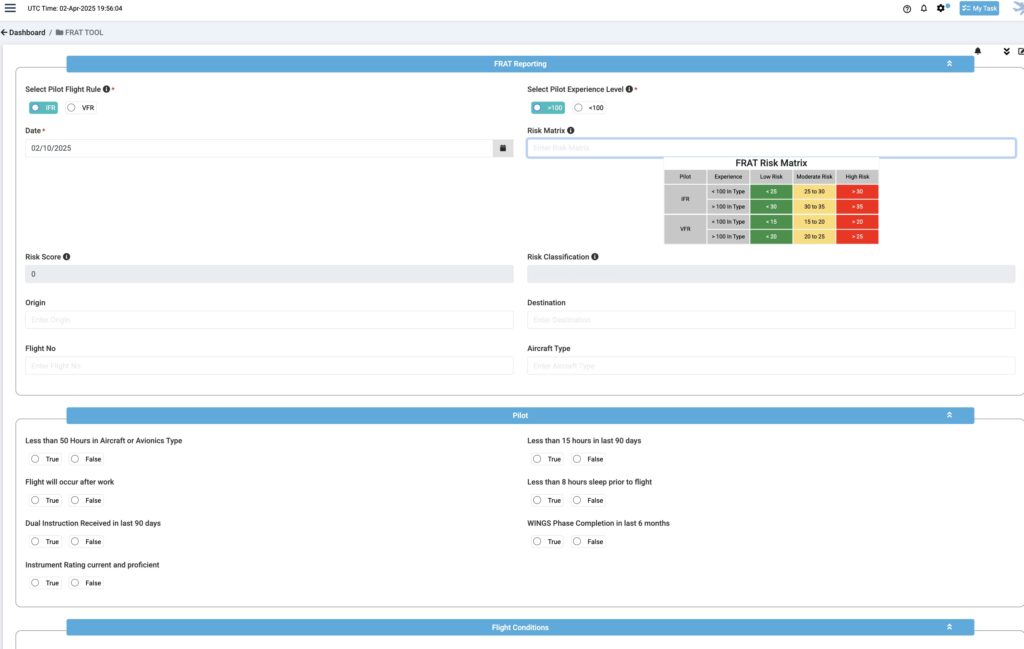 The Flight Risk Assessment Tool (FRAT) is an essential tool designed for manage the risks associated with flight operations. Developed in compliance with the Federal Aviation Administration (FAA) guidelines, FRAT helps flight crews, operators, and managers identify potential hazards and assess the level of risk before each flight. This ensures the safety and preparedness of the flight crew and enhances overall flight safety.